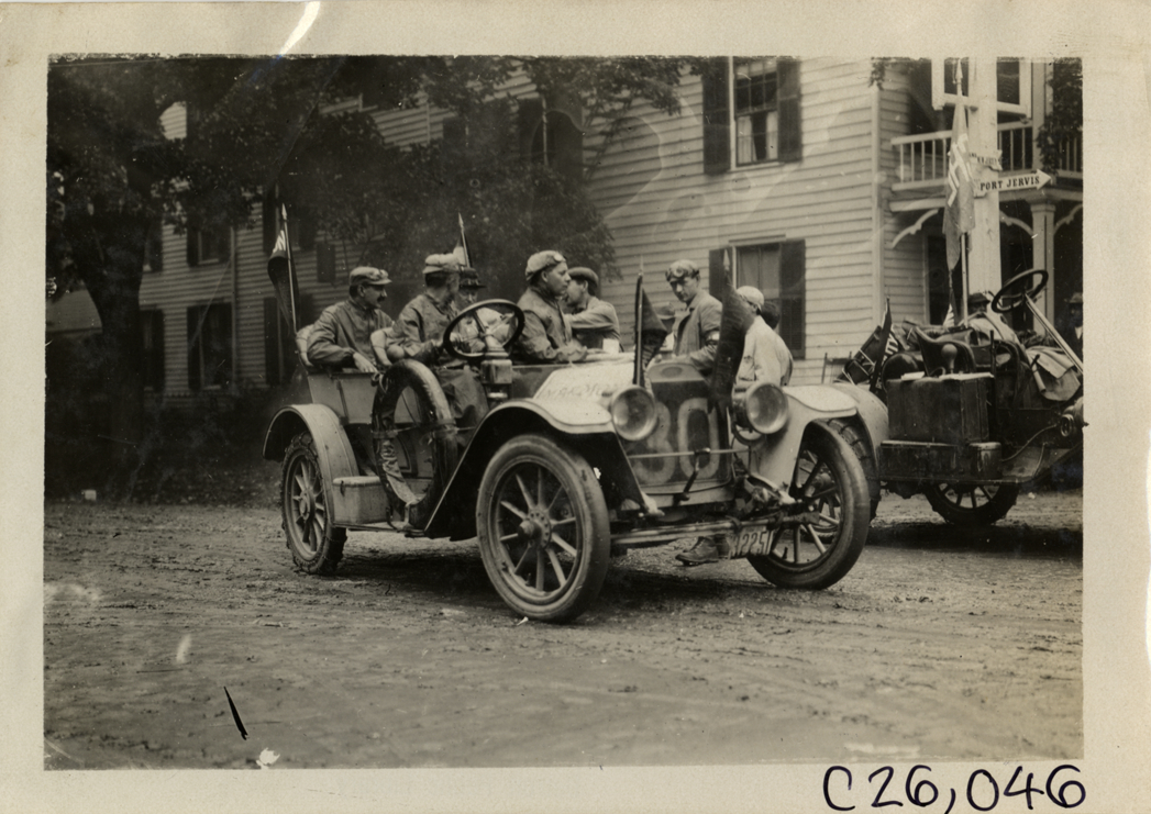 View of motorists in Marmon car no. 30 during the 1909 Munsey Reliability Run. Wooden-frame house in background. Handwritten on back: "Tours--Munsey Reliability Run, 1909."