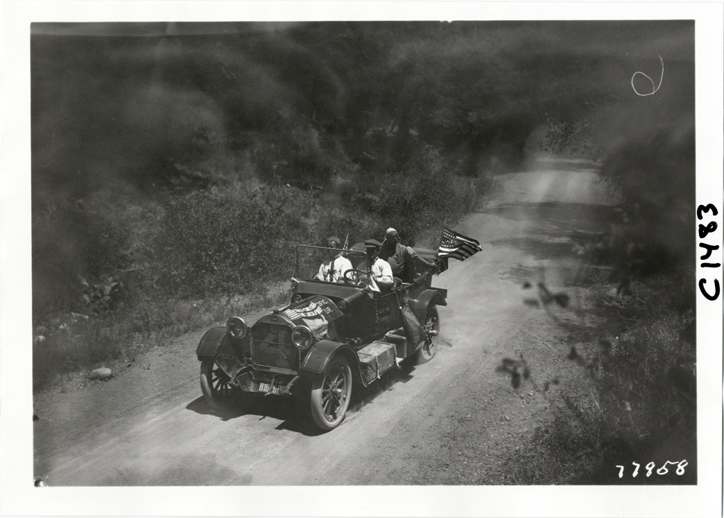 View of motorists in Henderson car no. 4 traveling on rural dirt road during the 1913 transcontinental tour organized by Indiana Automobile Manufacturers' Association. Handwritten on back: "#4 Henderson. Passengers: Frank Staley, W.S. Gilbreath, R.P. Henderson. Tours--I.A.M.A, 1913."