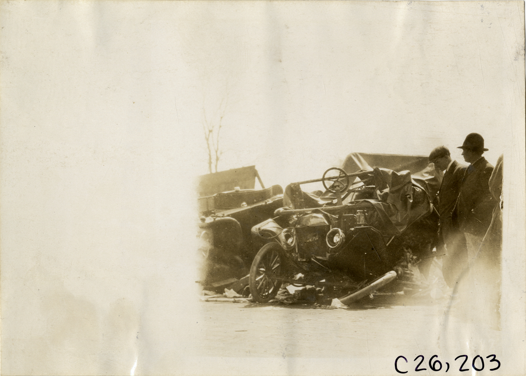 View of men looking at overturned and damaged cars on rural road during the 1910 New Jersey Reliability Run. The endurance run, sponsored by the Motor Contest Association, covered a route from New York to Atlantic City and return. Stamped on back: "Spooner & Wells, Inc., photographers, telephones 3472-3473 Columbus, 1931 Broadway, New York." Handwritten on back: "Tours--New Jersey Reliability Run, 1910."