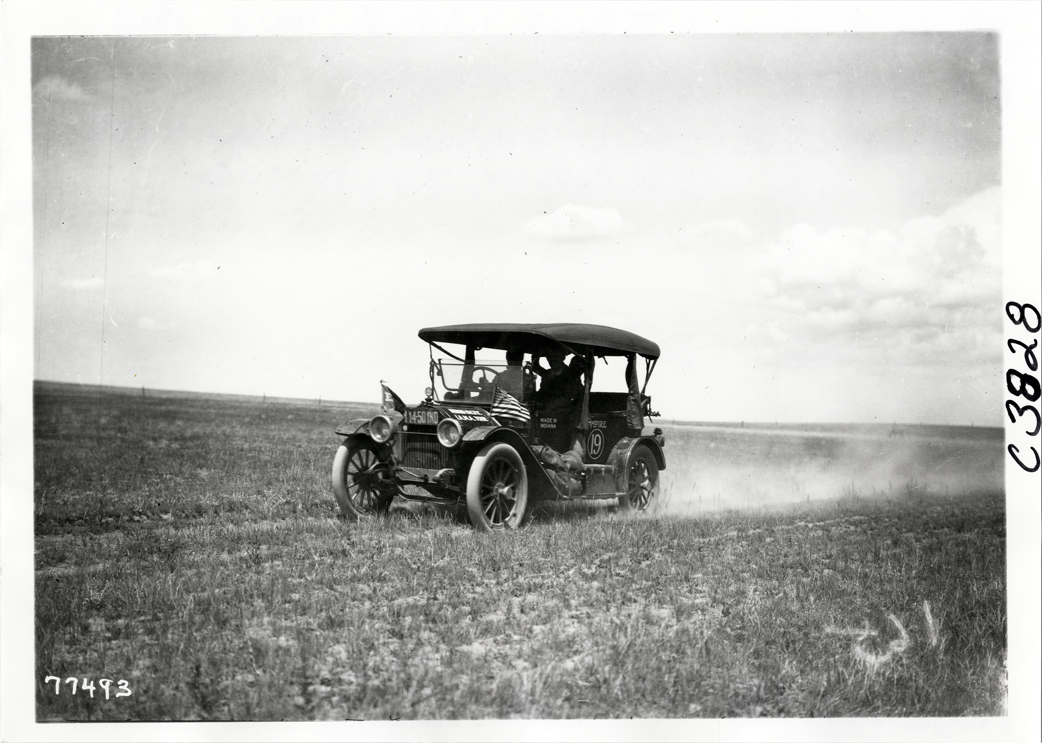 View of motorists in Empire car no. 19 traveling on rural dirt road during the 1913 transcontinental tour organized by Indiana Automobile Manufacturers' Association. Handwritten on back: "#19 Empire. Passengers: Cecil Gibson, Harlow Hyde, J.M. Cooley, Joe Moore. Tours--I.A.M.A, 1913."