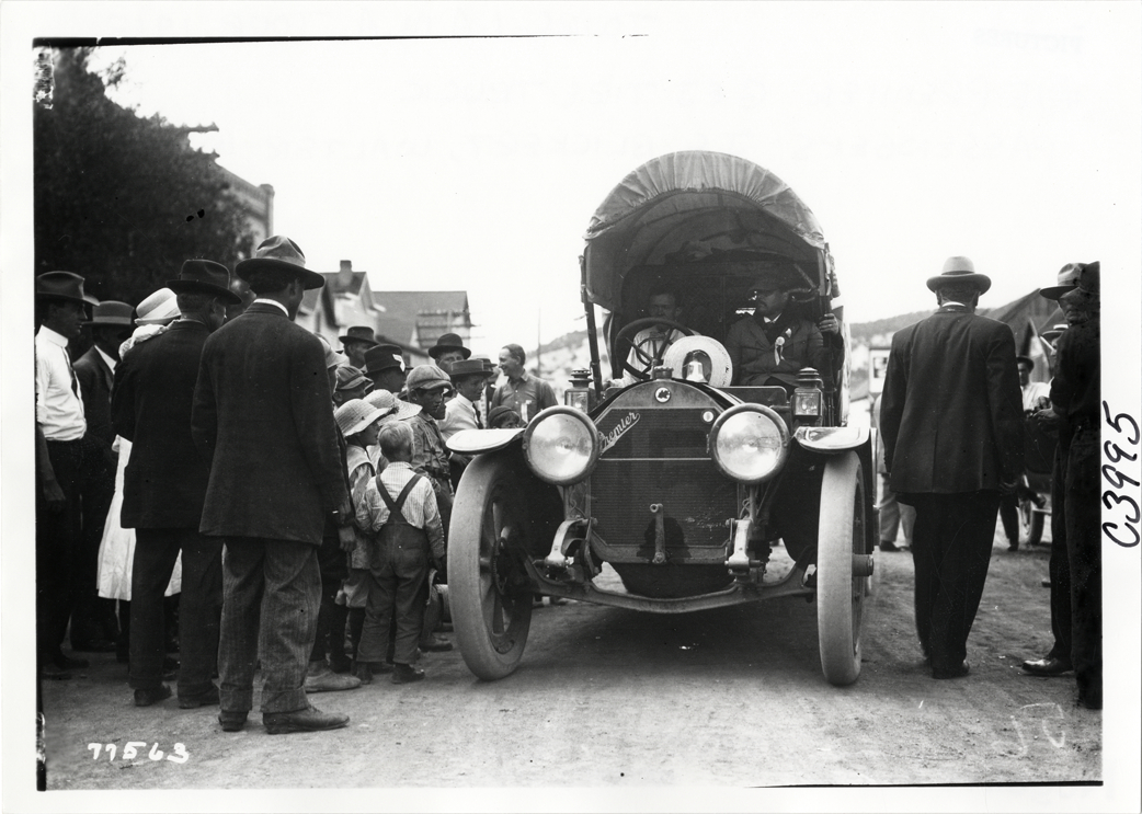 View of spectators surrounding Premier G & J tire truck during the 1913 transcontinental tour organized by Indiana Automobile Manufacturers' Association. Truck is decorated to resemble a covered wagon. Handwritten on back: "Premier, G & J tire truck, no. 15, J.E. Blickert, Walter Weidley. Tours--I.A.M.A, 1913."