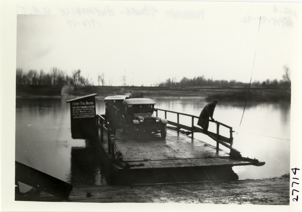 View of motorists and Hupmobile car on ferry crossing river during the Hupmobile United American Tour. Sign reads: "Ferry toll rates for automobiles 50 [cents]. No charge for return before midnight of the same day. No ferry charges except for automobiles." The tour was also known as the Hupmobile Capital-to-Capital tour. Handwritten on back: "Tours--Hupmobile U.A.T. 1916-17."