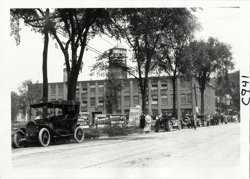 Motorists and spectators with automobile in front of Bridgeport Vehicle Co., 1910 Long Island Endurance Run