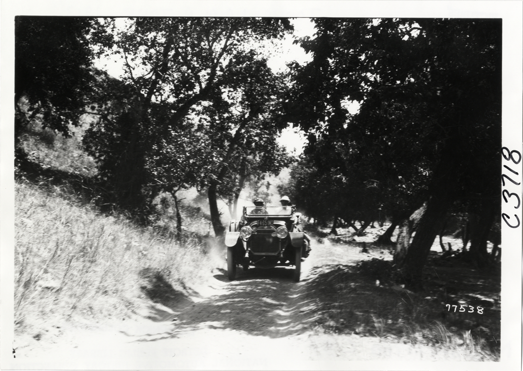 View of motorists in McFarlan car no. 16 traveling on rural dirt road during the 1913 transcontinental tour organized by Indiana Automobile Manufacturers' Association. Handwritten on back: "#16 McFarlan. Passengers: A. Dixon, Guy C. Core, Christopher Cox, Bert Adams. Tours--I.A.M.A, 1913."