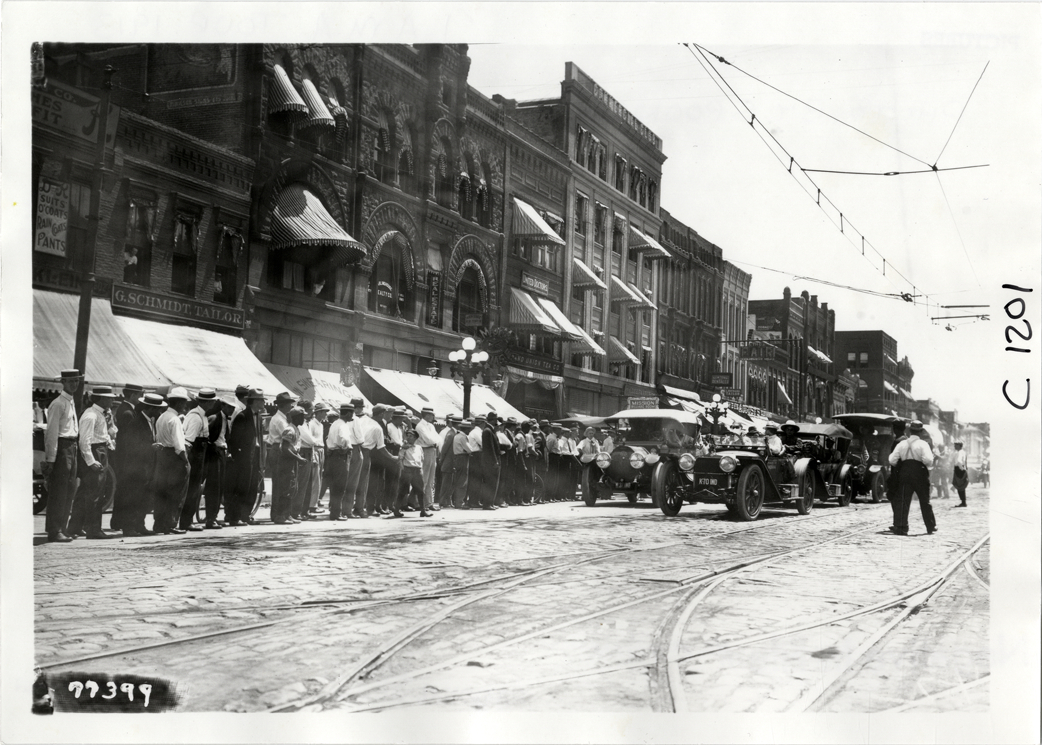 View of spectators looking at cars lined up in street during the 1913 transcontinental tour organized by Indiana Automobile Manufacturers' Association. Commercial buildings in background. Handwritten on back: "Photo by Spooner & Wells. Tours--I.A.M.A, 1913."