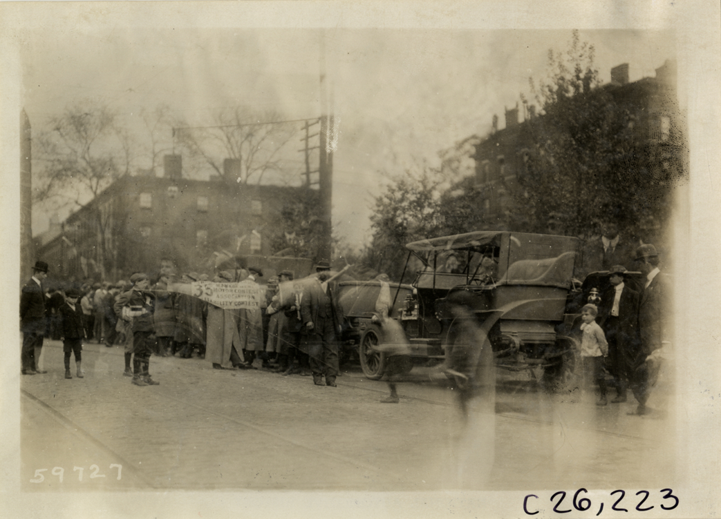 View of motorists and spectators with cars lined up in street during the 1910 New Jersey Reliability Run. The endurance run, sponsored by the Motor Contest Association, covered a route from New York to Atlantic City and return. Stamped on back: "Spooner & Wells, Inc., photographers, telephones 3472-3473 Columbus, 1931 Broadway, New York." Handwritten on back: "Tours--New Jersey Reliability Run, 1910."