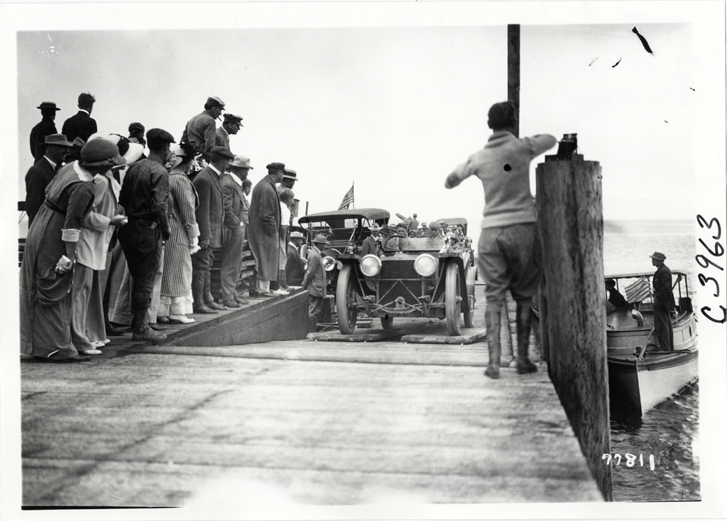 Motorists in American automobile on dock, 1913 Indiana Automobile Manufacturers' Association tour