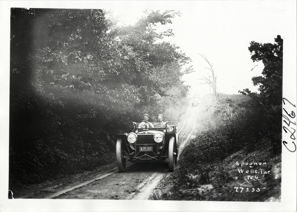 View of motorists in American car, followed by another car, traveling on rural dirt road during the 1913 transcontinental tour organized by Indiana Automobile Manufacturers' Association. Printed on front: "Spooner & Wells, Inc., N.Y." Handwritten on back: "American. Tours--I.A.M.A, 1913."