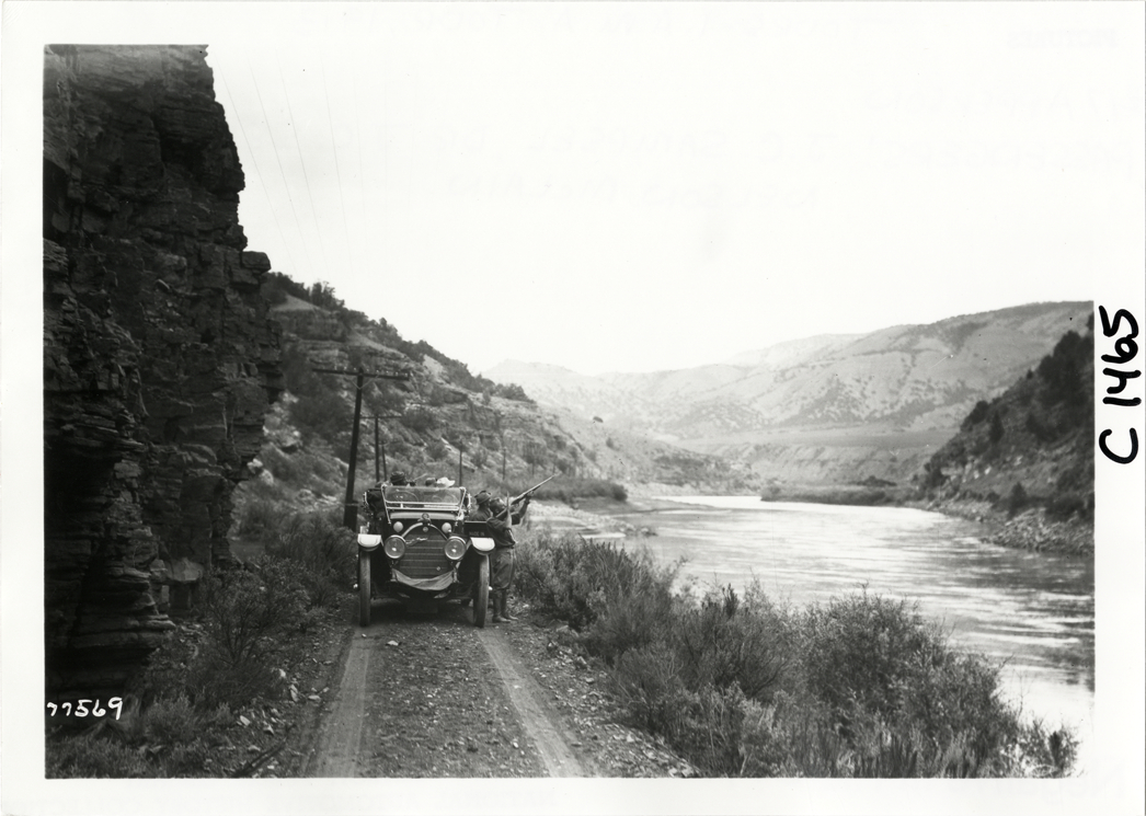 View of motorist shooting rifle next to Apperson car no. 17 on dirt road adjacent to river during the 1913 transcontinental tour organized by Indiana Automobile Manufacturers' Association. Handwritten on back: "#17 Apperson. Passengers: J.C. Sampsel, J.C. Sexton, Nelson McLain. Tours--I.A.M.A, 1913."