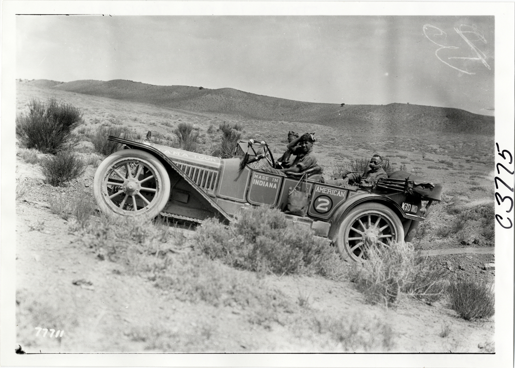 View of motorists in American car no. 2 posing on desert road during the 1913 transcontinental tour organized by Indiana Automobile Manufacturers' Association. Handwritten on back: "#2 American. Passengers: Ray Price, Dr. C.R. Strickland, Eddie Gouth. Tours--I.A.M.A, 1913."
