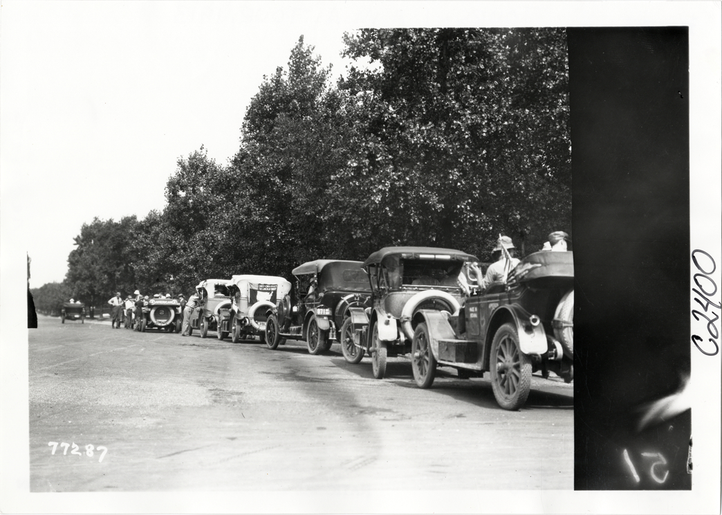Rear view of cars lined up on tree-lined street during the 1913 transcontinental tour organized by Indiana Automobile Manufacturers' Association. Handwritten on back: "Tours--I.A.M.A, 1913."