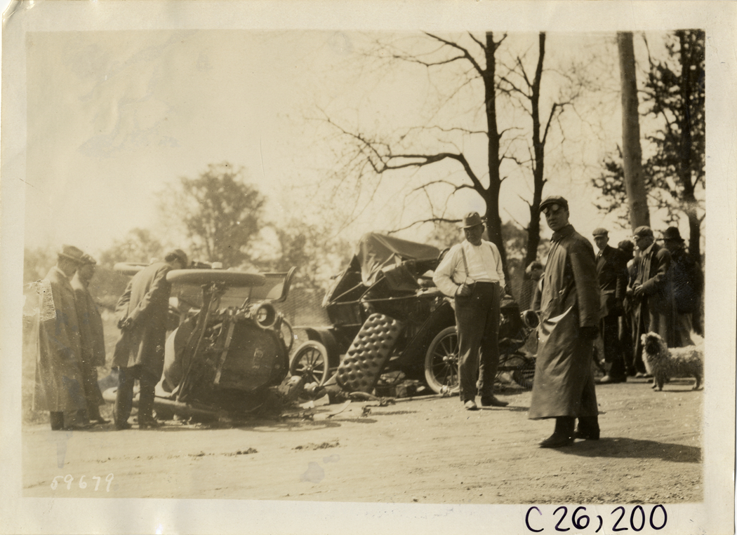 View of men looking at overturned and damaged cars on rural road during the 1910 New Jersey Reliability Run. The endurance run, sponsored by the Motor Contest Association, covered a route from New York to Atlantic City and return. Stamped on back: "Spooner & Wells, Inc., photographers, telephones 3472-3473 Columbus, 1931 Broadway, New York." Handwritten on back: "Tours--New Jersey Reliability Run, 1910."