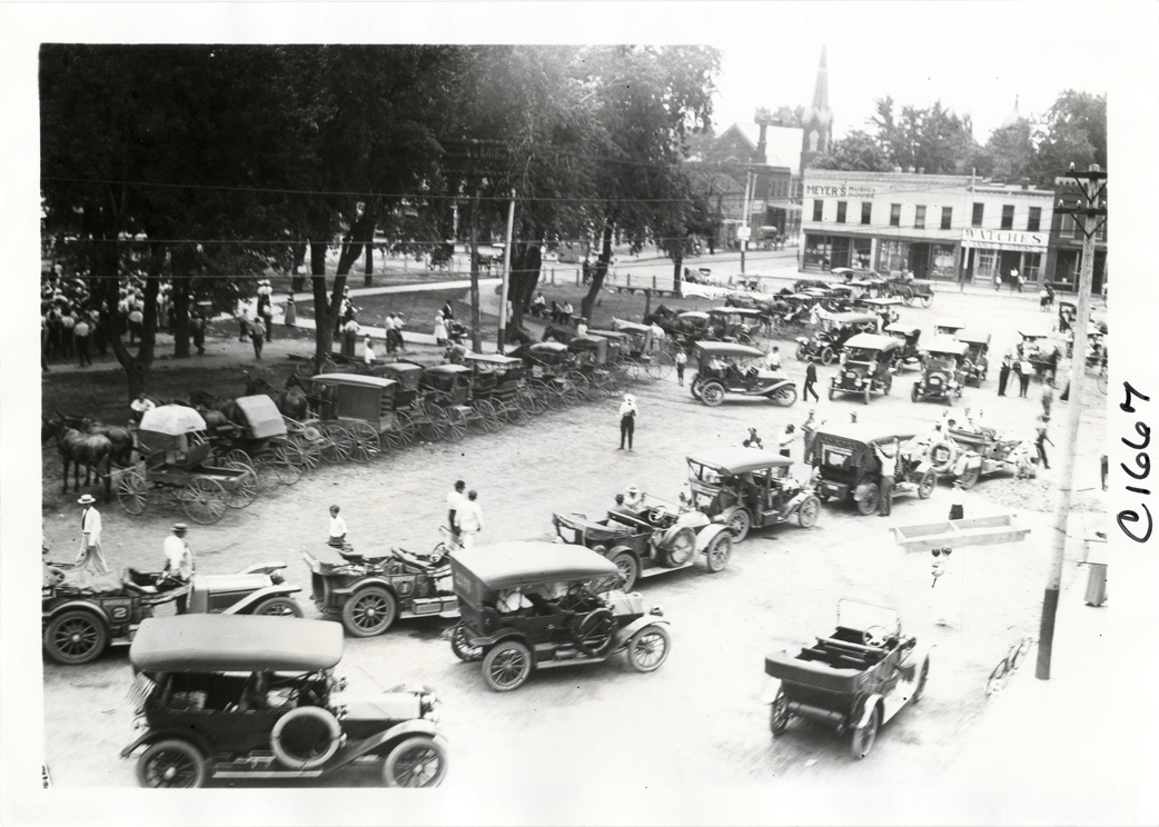 Automobiles lined up in street, 1913 Indiana Automobile Manufacturers' Association tour