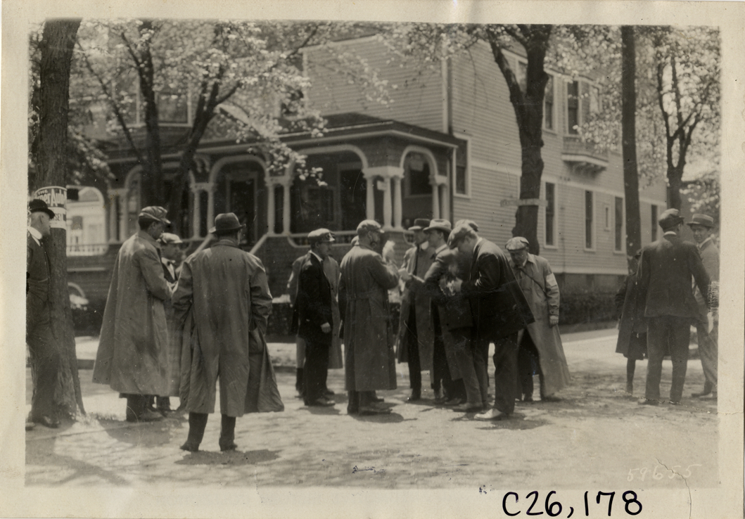 View of group of motorists conversing in middle of street during the 1910 New Jersey Reliability Run. Wooden-frame house in background. The endurance run, sponsored by the Motor Contest Association, covered a route from New York to Atlantic City and return. Stamped on back: "Spooner & Wells, Inc., photographers, telephones 3472-3473 Columbus, 1931 Broadway, New York." Handwritten on back: "Tours--New Jersey Reliability Run, 1910."