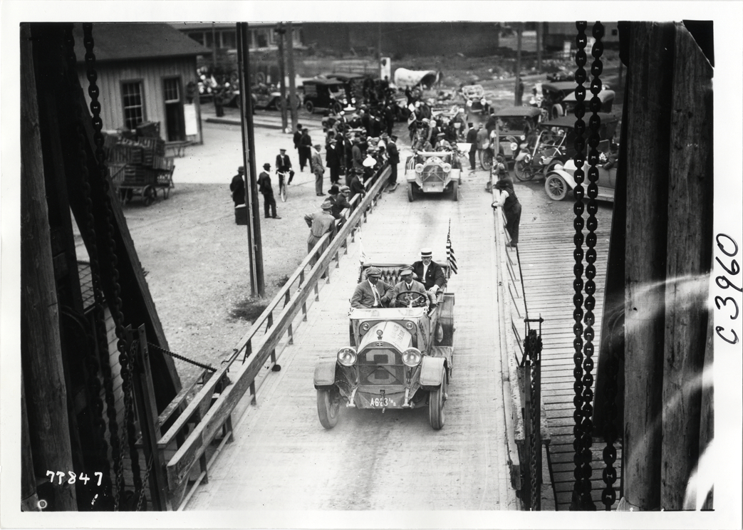 Bird's-eye view of motorists in Henderson car no. 3 on drawbridge during the 1913 transcontinental tour organized by Indiana Automobile Manufacturers' Association. Cars and onlookers in background. Handwritten on back: "Henderson, no. 3, D.M. Bell, Reed L. Parker, Allen C. Rankin, Ray Harroun. Tours--I.A.M.A, 1913."