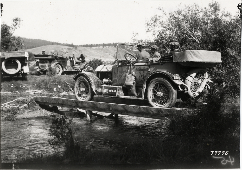 View of motorists in Henderson car no. 3 crossing wooden bridge over creek or river during the 1913 transcontinental tour organized by Indiana Automobile Manufacturers' Association. Handwritten on back: "Tours--I.A.M.A, 1913."