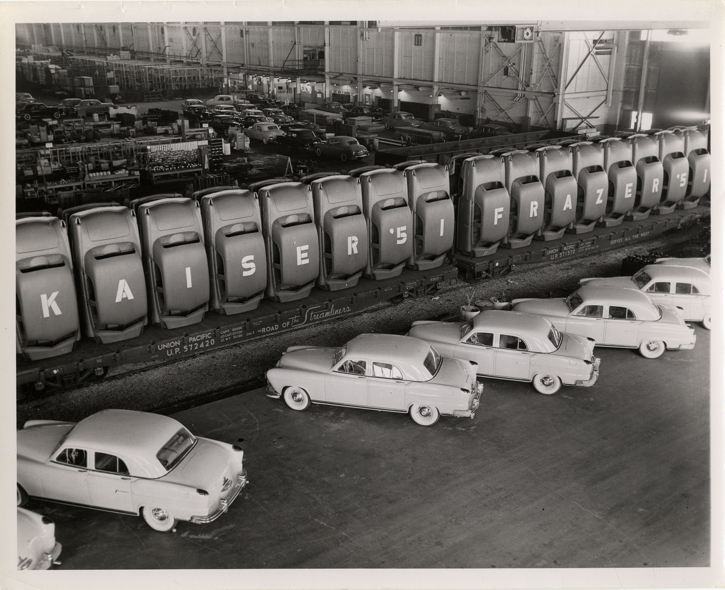 Kaiser automobiles on railroad flatcars, Kaiser-Frazer automobile factory