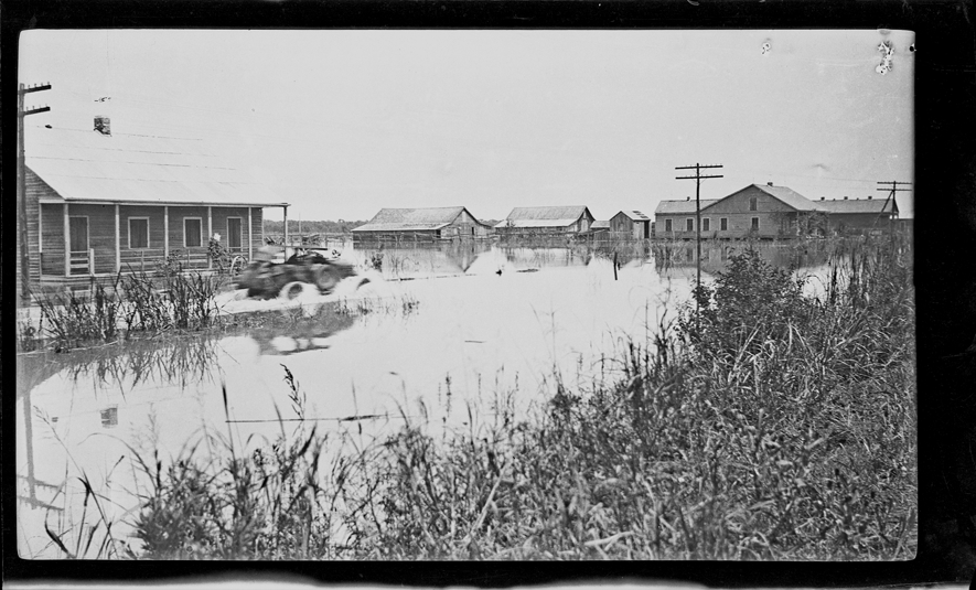 View of Wanderwell car speeding through flooded area in Mississippi.