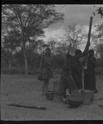 View of Aloha Baker watching Shangaan women use mortar and pestles. Handwritten on sleeve: "Mozambique, Shangaan wives pound corn, husbands dig diamonds in British South Africa."