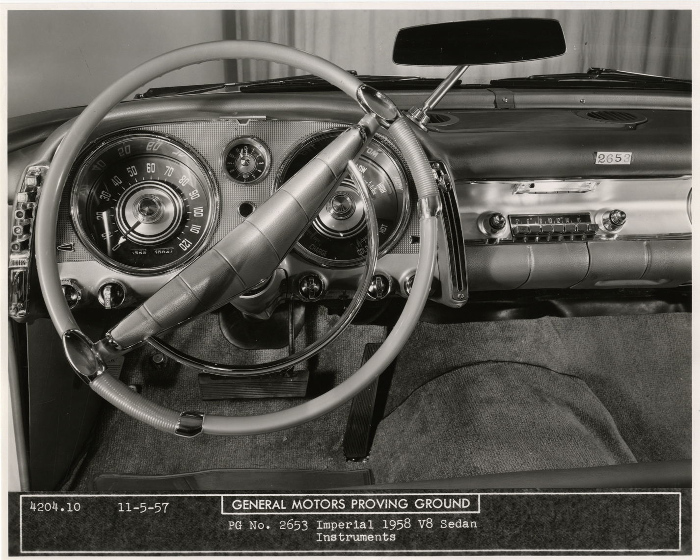 Close-up view of instrument panel of 1958 Imperial V8 car, showing steering wheel, radio, odometer and speedometer. Printed on front: "4204.10, 11-5-57, General Motors Proving Ground, PG no. 2653 Imperial 1958 V8 sedan, instruments."