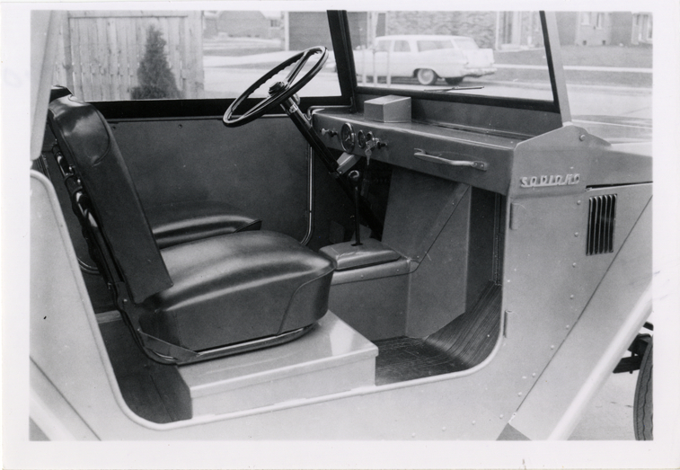 Side view of front seat of 1960 Saviano Scat utility car. Handwritten on back: "Scat, 1960. Side view."