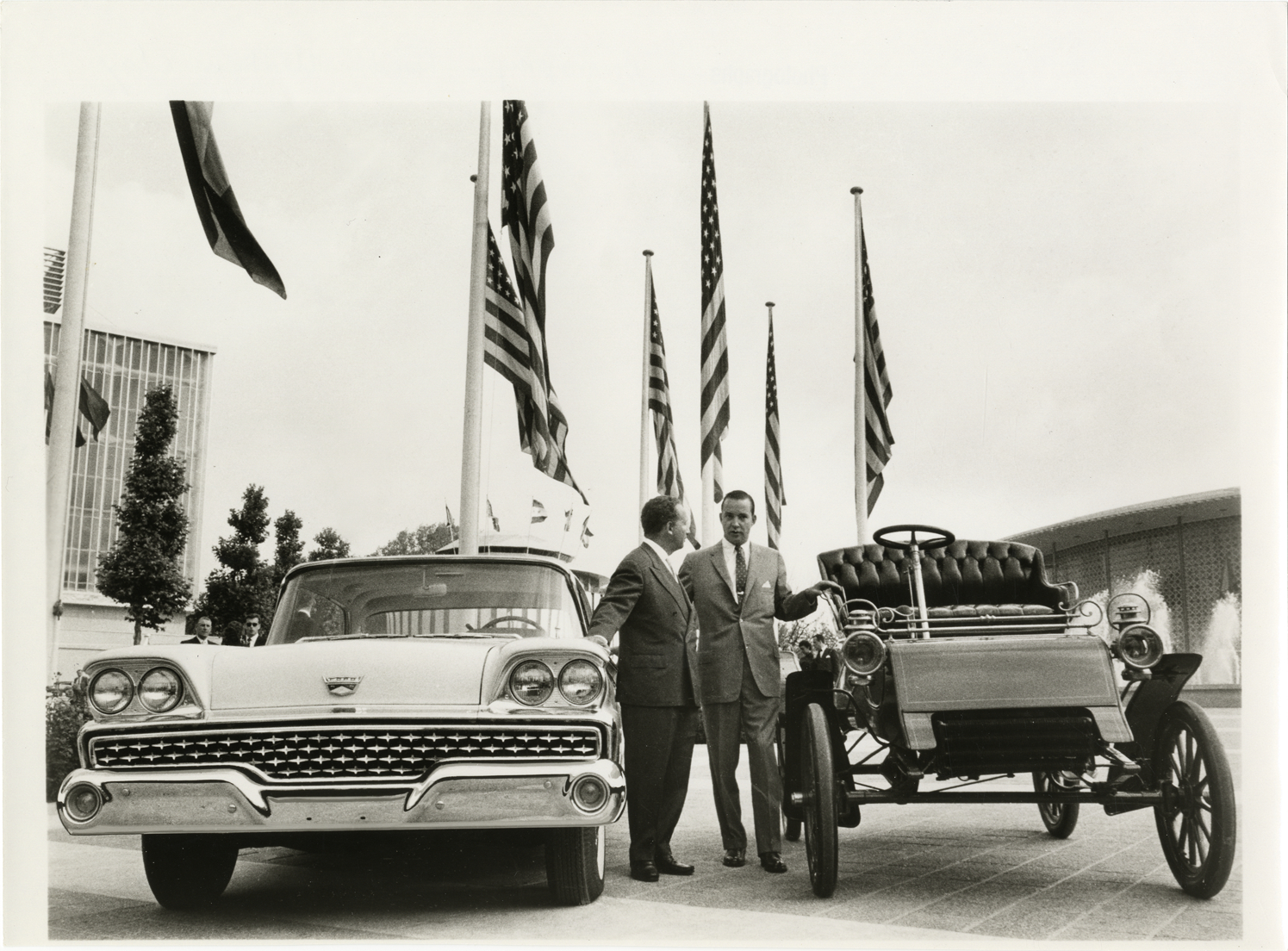View of William Clay Ford and Roger Zeiler with 1903 and 1959 Ford cars at the World's Fair in Brussels, Belgium. Typed on back: "William Clay Ford (right), Ford Motor Company vice president, and Roger Zeiler, president of the Comite Francais de l'Elegance, inspect the old and the new -- a 1903 Ford and a 1959 Ford -- at the World's Fair in Brussel, Belgium. In the background is the U.S. Pavilion, where Ford Motor Company received a Gold Medal from the Comite for the styling of the 1959 Ford."