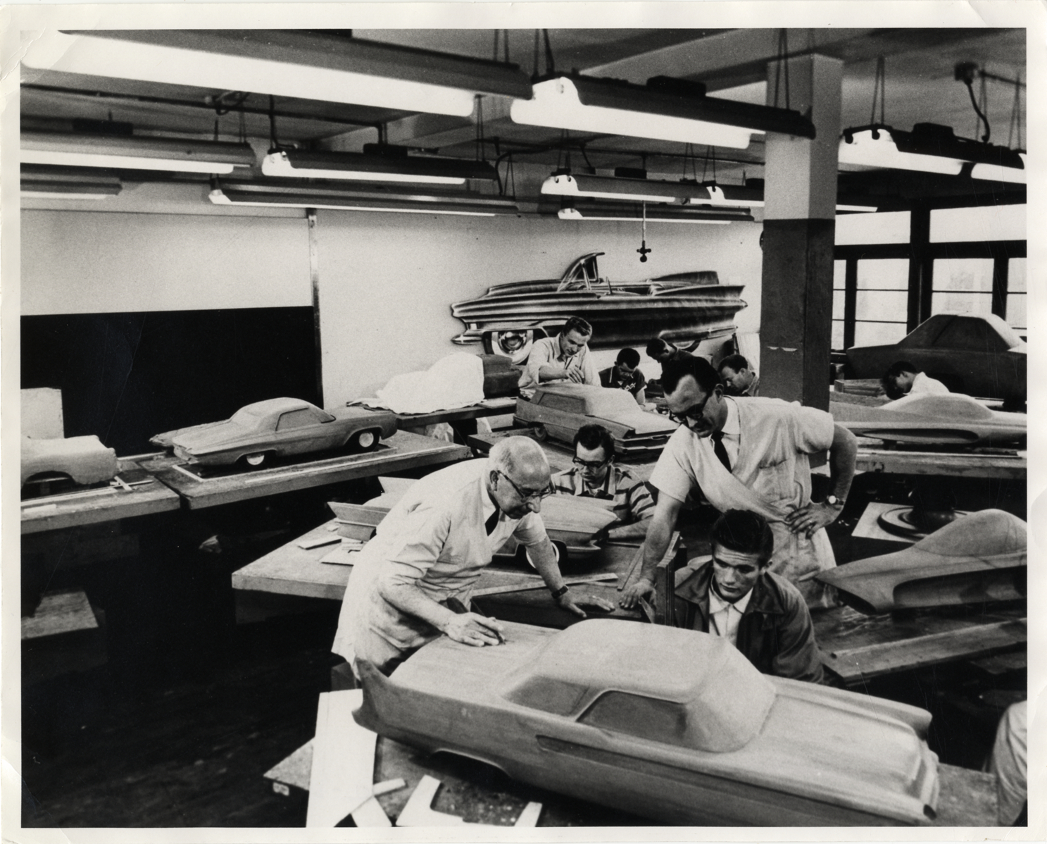View of Joe Thompson and workshop supervisor Joe Farrar instructing a student on creating an automobile model at the Art Center College of Design at Los Angeles, California. Typed on back: "Details, both photos. Joe Thompson, (left foreground), instructs industrial design students at Art Center College of Design in the art of model building. This photo taken in the 1950's shows the model workshop at Art Center's former Los Angeles campus. Note: the man second from the right in both pictures is Joe Farrar, workshop supervisor. For immediate release, contact: "Pat Rees Cummings, Public Relations Director, (213) 577-1700. 16 April 1980." Printed on back: "Art Center College of Design, 1700 Lida Street, Pasadena, California 91103, phone (213) 577-1700."