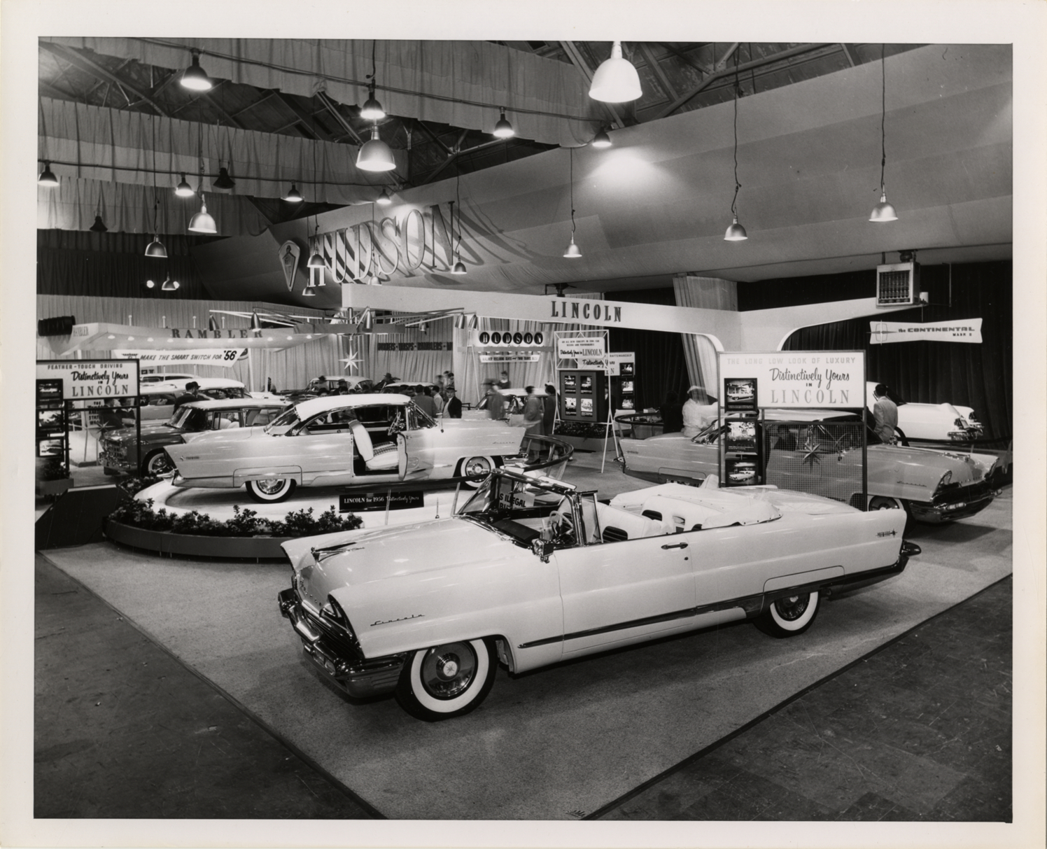 View of exhibit of Lincoln cars at the 1956 Detroit Auto Show. "Hudson" sign is displayed overhead on left.