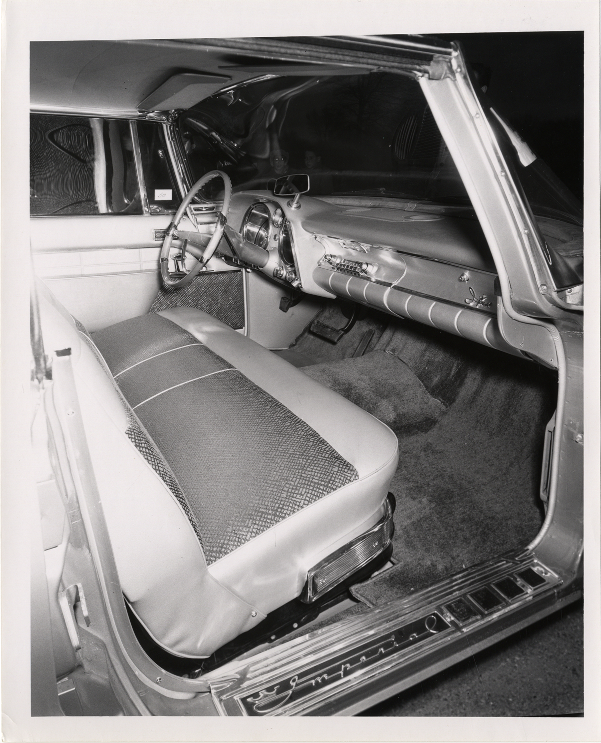 View of interior of 1958 Imperial car, showing front seat and steering wheel. Stamped on back: "1958 Imp, 4 dr, ht."