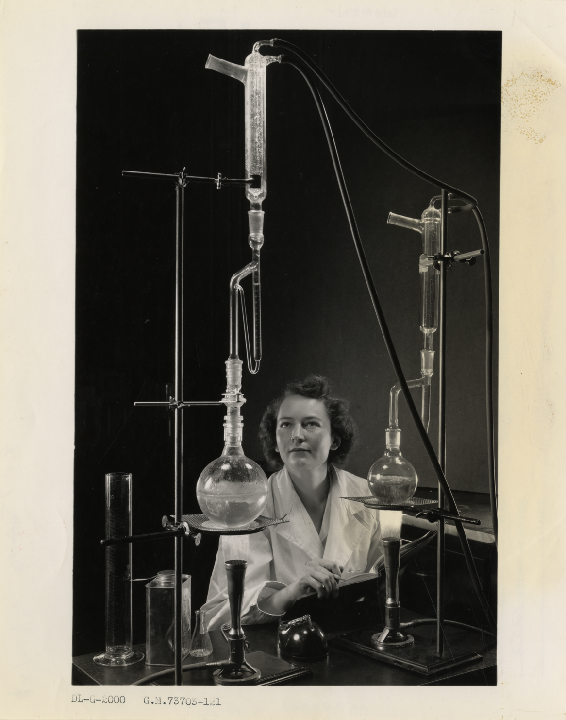 View of woman chemist testing used motor oil samples for dilution by water or gasoline. Stands hold glass test tubes and flasks. Burners in foreground. Typed on front: "DL-G-2000, G.M. 73703-121." Typed on back: "The life of vital engine parts depends to a large measure on good lubrication of the working surfaces. Here, a research chemist checks used motor oil samples for dilution by water or gasoline."