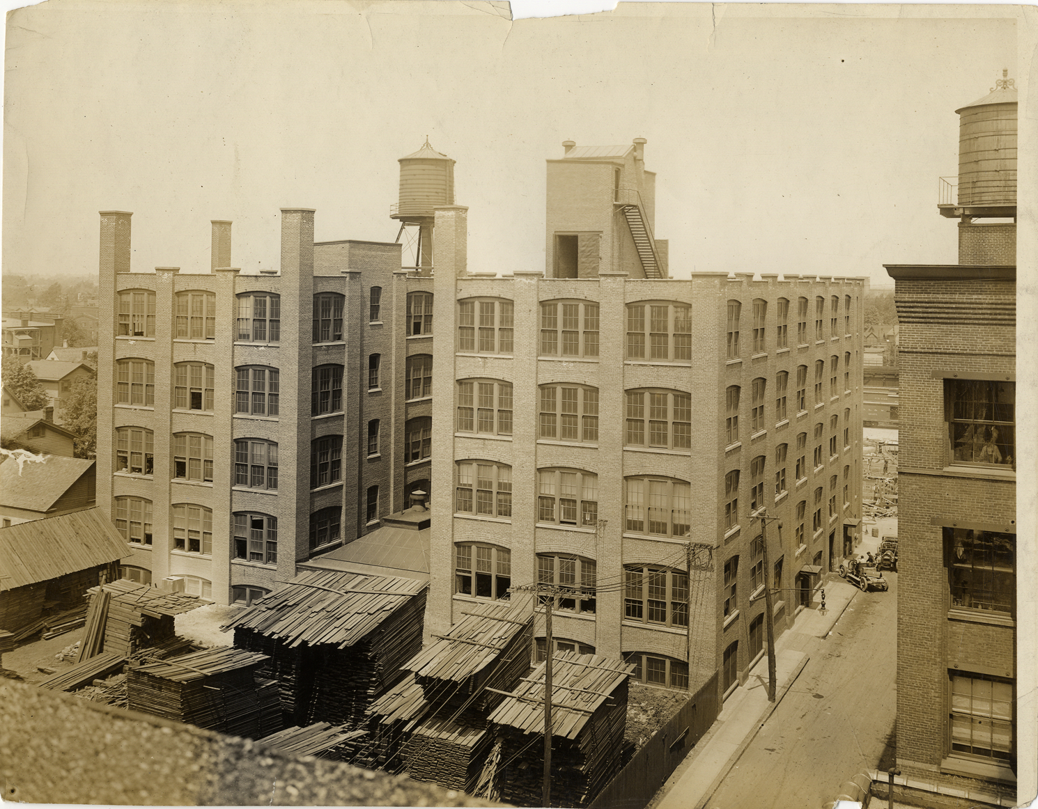 View of brick automobile factory building at Litchfield St. for the James Cunningham, Son & Co. Lumber is stacked on pallets in foreground. Typed on back: "Cunningham, Litchfield St. plant, chassis asem. [sic], machine shop, engine assembly." Handwritten on back: "Engine and chassis plant."