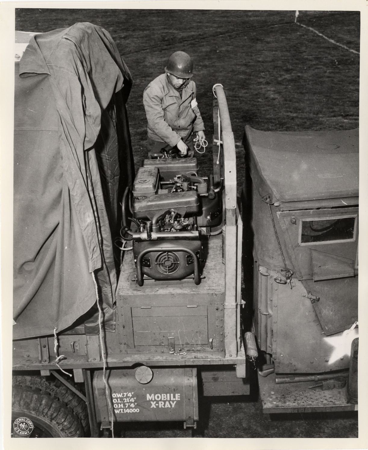 View of soldier examining generators mounted on mobile x-ray unit truck at United States Medical Field Service School somewhere in the European Theater of Operations. Printed on front: "Signal Corps, U.S. Army." Typed on back: "Generators mounted on 6 x 6 mobile x-ray unit at the medical field service school somewhere in the ETO."