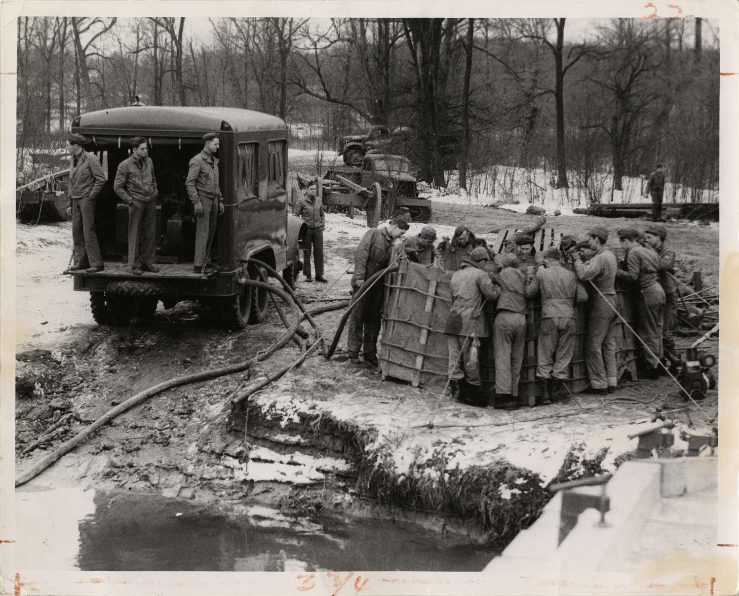 View of group of soldiers gathered around unidentified fenced enclosure. Three soldiers stand on back of adjacent military truck; hoses lead from truck into enclosure and drainage ditch. Two trucks in background. Stamped on back: "Photo by Herb Bauer, Michigan Pictures, 238 Capital Ave. N.E., Battle Creek, Mich."
