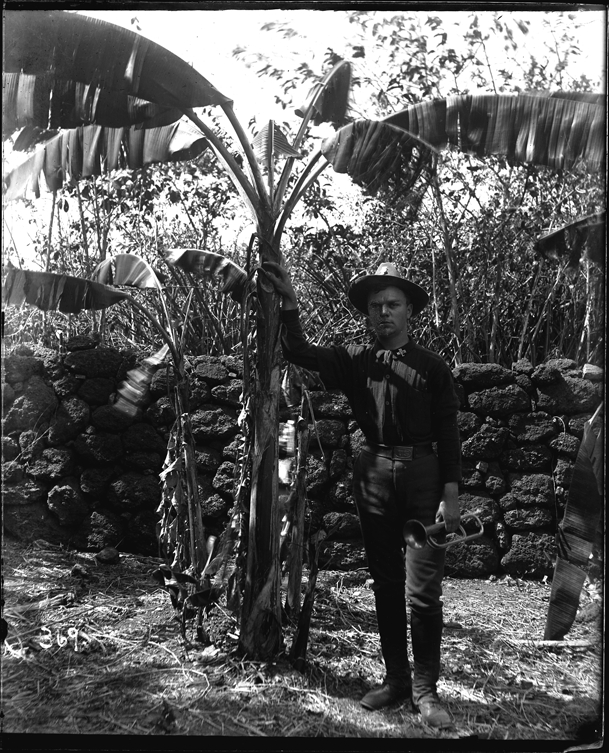 Soldier holding a bugle leans against a banana tree. Recorded in ledger: "In the banana grove, John H. Freck, Co. L."
