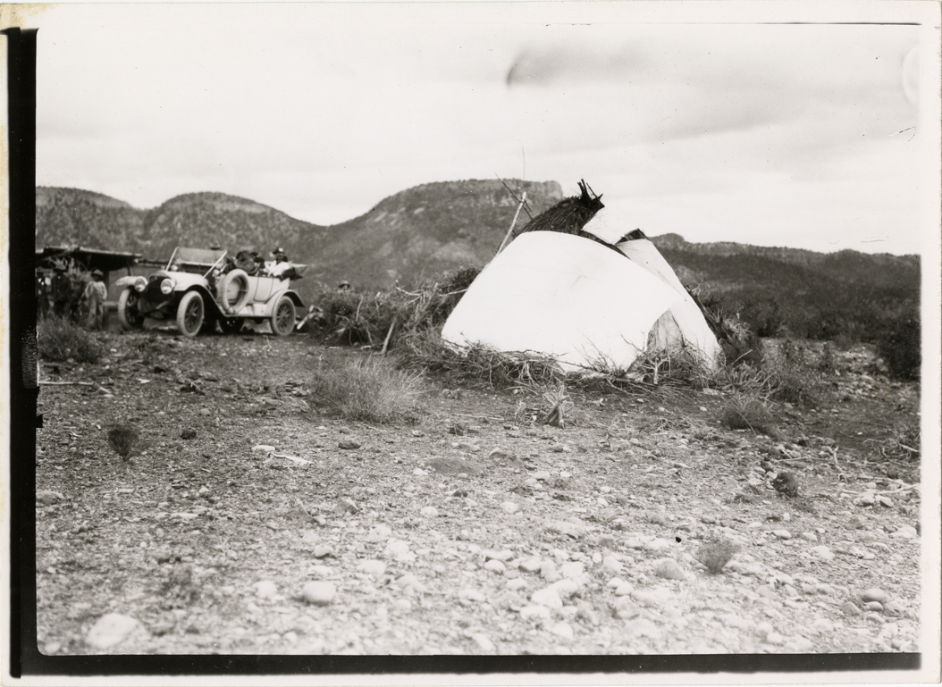 View of motorists in 1913 White car parked next to Apache teepee during a 1912 pathfinding tour from Denver, Colorado to Salt Lake City, Utah. Stamped on back: "Photographic illustration by Nick Lazarnick, 230 Park Ave., N.Y." Handwritten on back: "White River Apache in New Mexico. White, 1913."