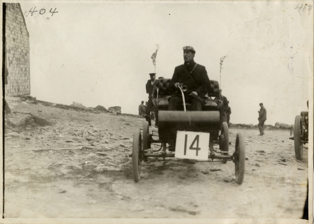 View of Benjamin Smith in Oldsmobile car no. 14 during the Climb to the Clouds hill climb, 1904 White Mountains tour. The events included an endurance run in the White Mountains and the Climb to the Clouds Hill Climb on Mount Washington. Handwritten on back: "Climb to the Clouds hill climb, car #14, Oldsmobile, driven by Benjamin Smith. Tours--White Mountains tour, 1904."