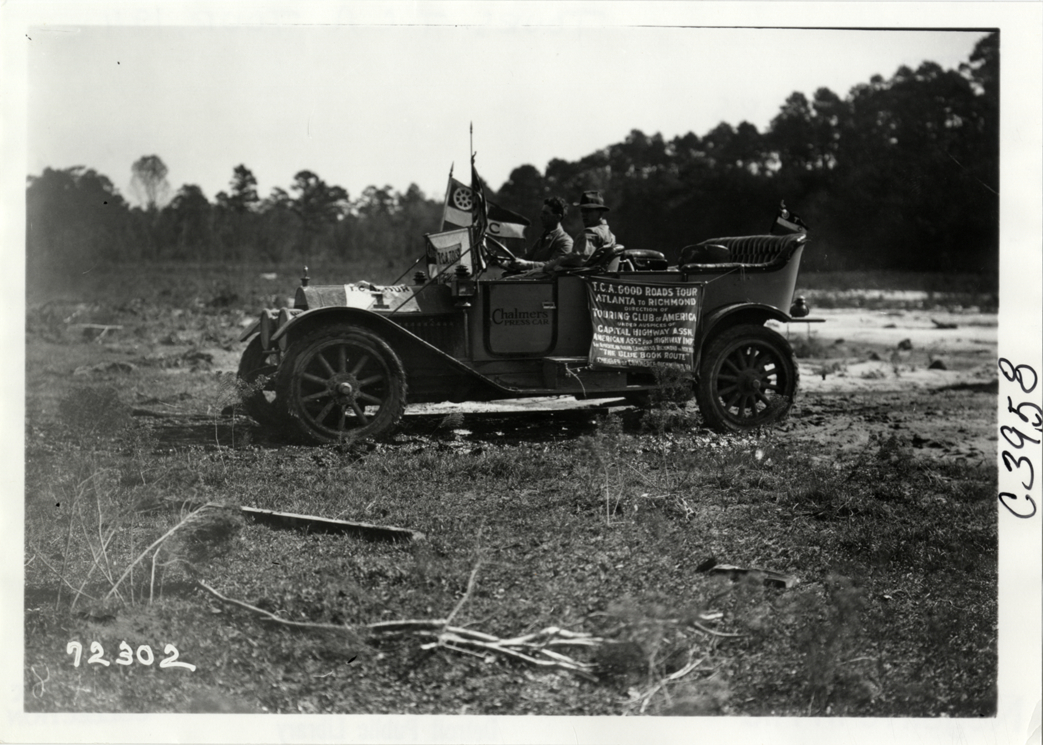 View of motorists in Chalmers car no. 1 on muddy road during the 1911 Good Roads Tour sponsored by the Touring Club of America. The tour covered a route from Atlanta, Georgia to Richmond, Virginia. Handwritten on back: "#1 Chalmers. Tours--Touring Club of America tour, 1911."