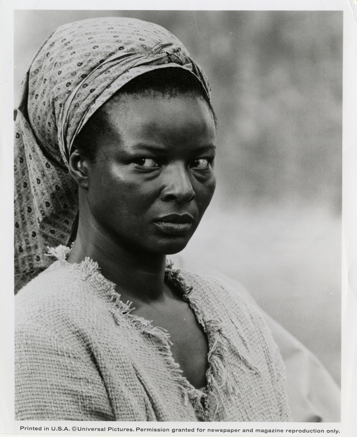 Portrait of singer and actress Mae Mercer. Typed on back: "Defiant slave. Blues singer-actress Mae Mercer shows contempt for her white masters in this scene from Universal/Malpaso's Civil War drama, 'The beguiled,' in which she co-stars with Clint Eastwood, Geraldine Page and Elizabeth Hartman." Handwritten on back: "Mae Mercer."