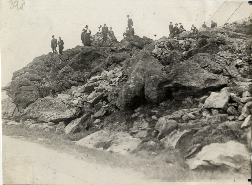 View of spectators on rocky outcrop at the top of Mount Washington during the 1904 White Mountains tour. The events included an endurance run in the White Mountains and the Climb to the Clouds Hill Climb on Mount Washington. Handwritten on back: "On the rocks, top of Mt. Washington. Tours--White Mountains tour, 1904."