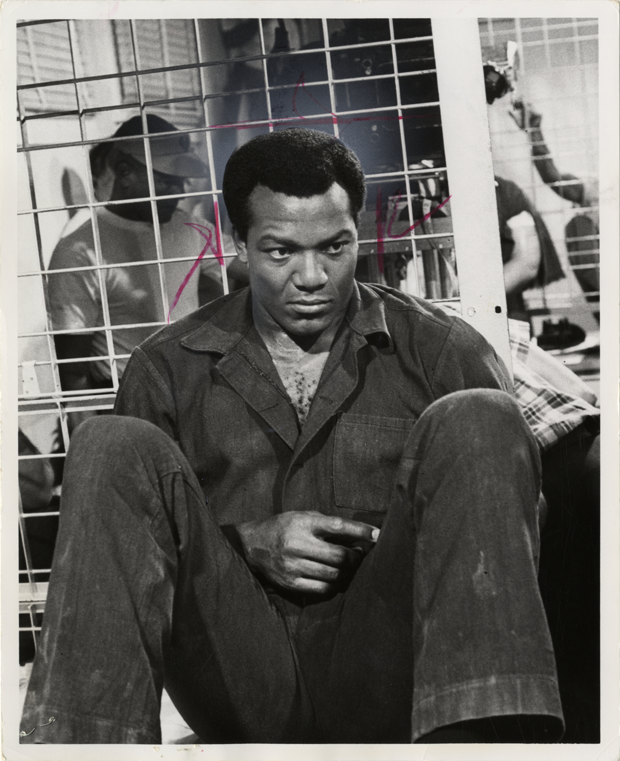 Portrait of actor Jim Brown in a scene from an unidentified motion picture. Handwritten on back: "Jim Brown."