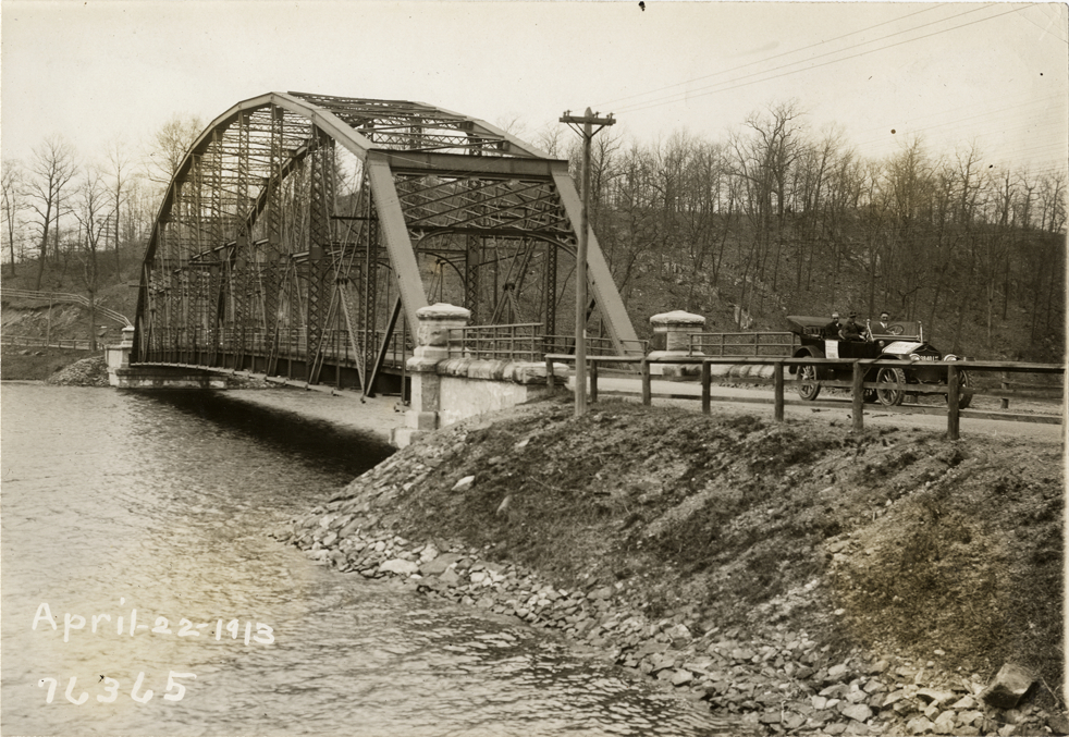 View of motorists in National car crossing bridge during the 1913 Overman tires 10,000 mile demonstration. The car was outfitted with a set of Overman cushion tires and driven over different routes and road surfaces within a 50 mile radius of New York, New York. Printed on front: "April-22-1913." Stamped on back: "Spooner & Wells, Inc., photographers, 1931 Broadway, N.Y. City, phones 3472-3473 Col." Handwritten on back: "Tours--Overman tires 10,000 mile demonstration, 1913."