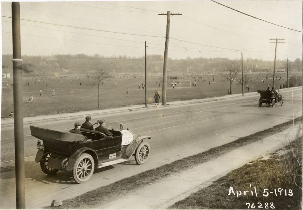 View of motorists in National car passing athletic field during the 1913 Overman tires 10,000 mile demonstration. The car was outfitted with a set of Overman cushion tires and driven over different routes and road surfaces within a 50 mile radius of New York, New York. Printed on front: "April-5-1913." Stamped on back: "Spooner & Wells, Inc., photographers, 1931 Broadway, N.Y. City, phones 3472-3473 Col." Handwritten on back: "Tours--Overman tires 10,000 mile demonstration, 1913."