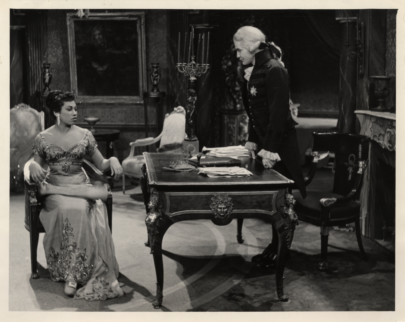 View of soprano Leontyne Price and unidentified singer in Puccini's opera, "Tosca." Stamped on back: "NBC photo." Handwritten on back: "Price, Leontyne."