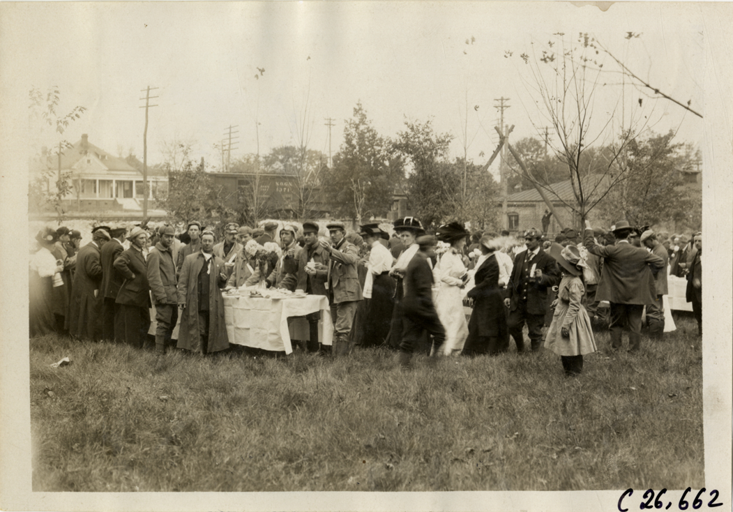 View of spectators at a reception in field during the 1909 New York to Atlanta Good Roads Tour. Some men and women stand at cloth-covered tables enjoying refreshments; railroad freight car in background. Stamped on back: "Spooner & Wells, Inc., photographers, telephones 3472-3473 Columbus, 1931 Broadway, New York." Handwritten on back: "Tours--New York-Atlanta Good Roads Tour, 1909."