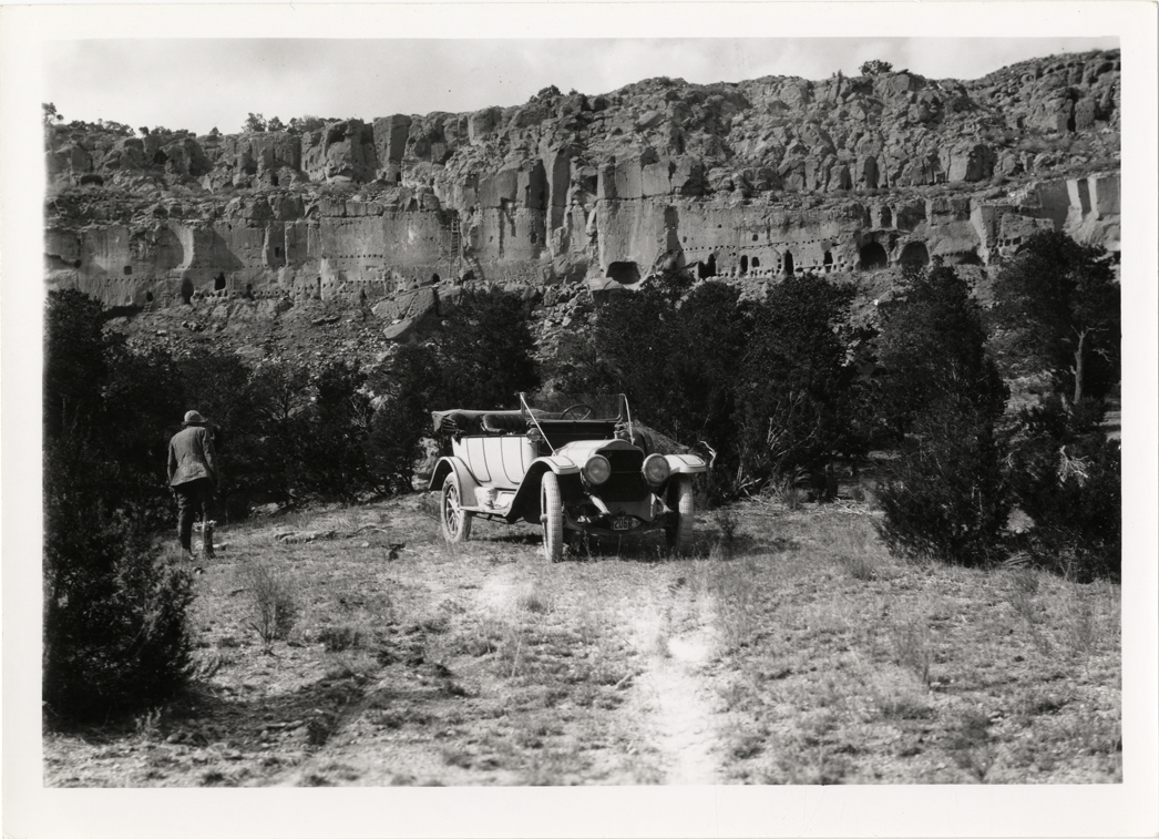 View of motorist with 1913 White car in front of cliff dwellings during a 1912 pathfinding tour from Denver, Colorado to Salt Lake City, Utah. Handwritten on back: "1912 SW White trip. White, 1913."