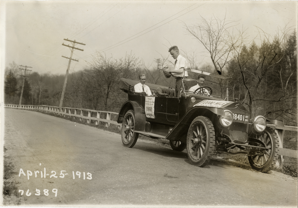 View of motorists in National car on rural dirt road during the 1913 Overman tires 10,000 mile demonstration. The car was outfitted with a set of Overman cushion tires and driven over different routes and road surfaces within a 50 mile radius of New York, New York. Printed on front: "April-25-1913." Stamped on back: "Spooner & Wells, Inc., photographers, 1931 Broadway, N.Y. City, phones 3472-3473 Col." Handwritten on back: "Tours--Overman tires 10,000 mile demonstration, 1913."