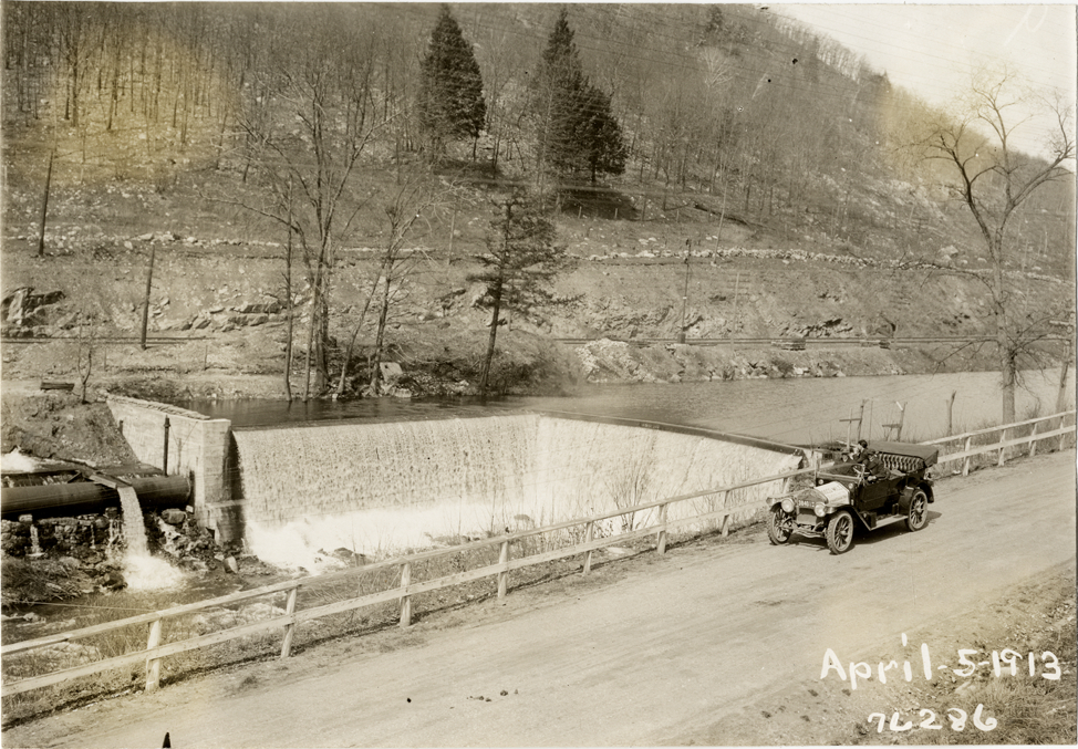 View of motorists in National car looking at dam during the 1913 Overman tires 10,000 mile demonstration. The car was outfitted with a set of Overman cushion tires and driven over different routes and road surfaces within a 50 mile radius of New York, New York. Printed on front: "April-5-1913." Handwritten on back: "Tours--Overman tires 10,000 mile demonstration, 1913."