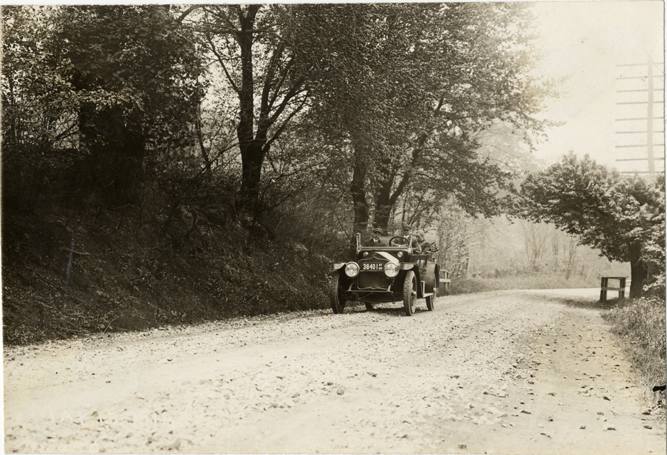 View of motorists in National car traveling on tree-lined rural dirt road during the 1913 Overman tires 10,000 mile demonstration. The car was outfitted with a set of Overman cushion tires and driven over different routes and road surfaces within a 50 mile radius of New York, New York. Printed on front: "May-13-1913." Stamped on back: "Spooner & Wells, Inc., photographers, 1931 Broadway, N.Y. City, phones 3472-3473 Col." Handwritten on back: "Tours--Overman tires 10,000 mile demonstration, 1913."