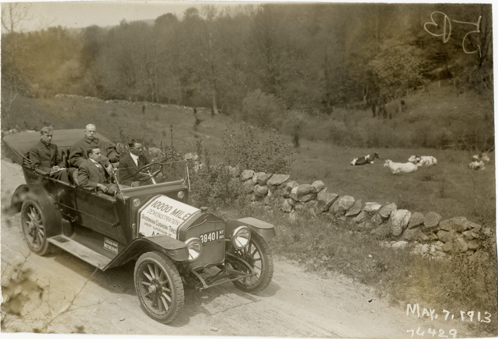 Motorists in National automobile looking at cows on roadside, 1913 Overman tires 10,000 mile demonstration
