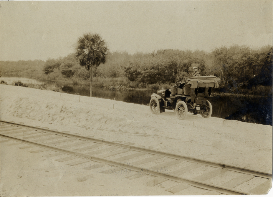 View of motorists in 1905 Model "E" White Steamer car traveling on rural dirt road in Florida. Railroad tracks in foreground; palm tree in background. Stamped on back: "Photo by N. Lazarnick, 29 West 42nd Street, New York." Handwritten on back: "This was one of six cars that toured in Florida after the Ormond-Daytona races and just before leaving for the Cuba Race. The date was Feb. 2, 1906. White Steamer, 1905. Model E."